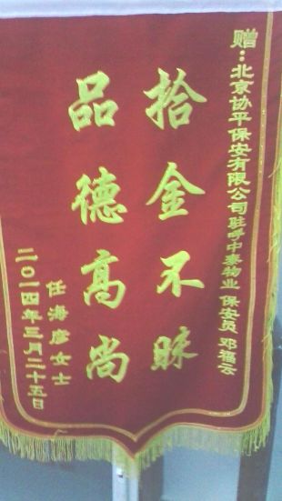 2014年3月25日驻内蒙古中泰物业服务有限责任公司(六项目部呼市兴泰御都)保安队的西门岗队员邓福云早上5点多在塞上府饭店的停车场捡到一个钱包,内有身份证、银行卡6张及现金800元和港币200元。邓福云马上联系饭店的工作人员请他们帮忙联系失主,如联系到失主请他到西门岗领取失物。等到下班后也没有等到失主,邓福云想到失主的银行卡应该留有联系方式,于是到兴业银行请工作人员查失主的联系方式,可没有打通。等邓福云回到宿舍后,接到了失主的电话,在确认钱包是失主后,邓福云将钱包还给失主。失主很感谢邓福云,从包里拿出礼物给邓福云,邓福云没有接受。失主为了表达谢意,给保安队送上一面锦旗。