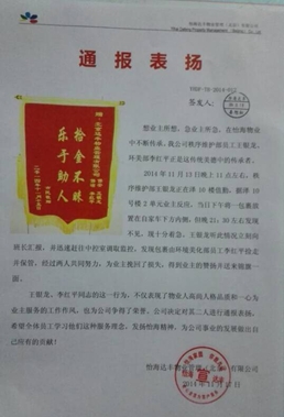 2014年11月13日晚上,怡海花园泽10号楼2单元业主找到保安员反映,当日下午将一包裹放置在自家车筐内。但晚21:30左右发现不见了,现十分着急。当时秩序维护部的王银龙正在值勤,听到此情况后,立即向班长汇报,并迅速赶往中控室调取监控。通过监控发现包裹由环境美化部的员工捡走。经过两人的积极联系和查找,最后为业主将包裹找到,保安员认真负责,积极为业主解难的行为得到业主的高度赞扬并送来锦旗一面。怡海达丰物业管理(北京)有限公司对王银龙同志给予全公司表扬,希望全体员工学习他们的服务理念,为公司事业的发展做出自己应有的贡献!