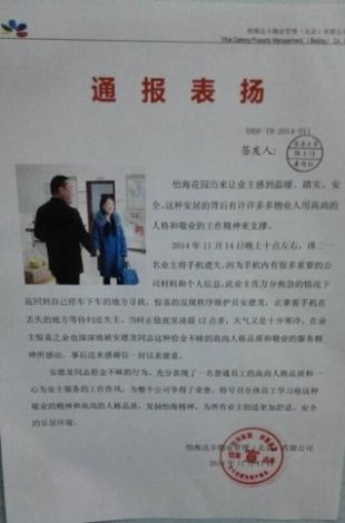2014年11月14日晚上十点左右,怡海花园的一业主将手机遗失。因为手机内有很多重要的公司材料和个人信息,此业主在万分焦急的情况下返回到自己停车下车的地方,惊喜的发现驻怡海花园的秩序维护员安德龙,正拿着手机在丢失的地方等待归还。当时正值夜里凌晨12点多,天气又十分寒冷。在业主惊喜之余也深深地被安德龙同志这种拾金不昧的高尚人格品质和敬业的服务精神所感动。事后,该业主专门送来感谢信一封以表谢意。怡海达丰物业管理(北京)有限公司号召全体员工学习安德龙的敬业精神和高尚的人格品质。