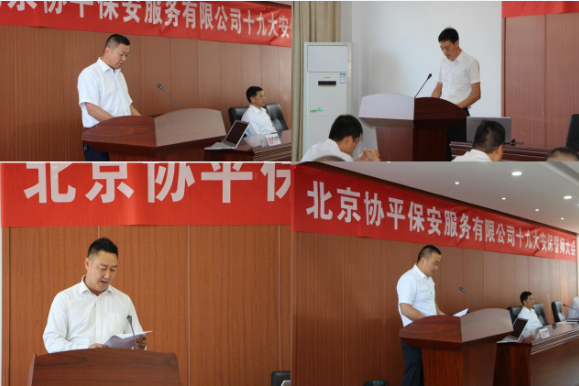 上午9时,誓师大会在国歌声中隆重开幕。公司驻国家体育馆保安队队长候向东、驻三里屯外交公寓外事警卫队队长艾中国、驻公交线路乘务员队长杨奇超、十一项目部经理仝瑞祥等作为管理干部代表在誓师大会上进行了发言。大家根据各自不同的工作岗位和工作职责,就本单位如何做好十九大安保工作分别进行汇报。李建国副总经理在誓师会上宣读了公司《十九大安保工作方案》,对各单位在思想动员、客户安全、人员安全、辅警工作、信息上报工作等各方面工作进行了详细的再部署,对各单位如何落实十九大安保工作任务进行了详细的要求。