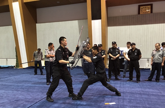 北京青年报记者在培训现场看到,学校的安保人员手持盾牌站成一排,随着特警教官一声令下,一齐向前推出盾牌。随后,特警教官手持尖刀,模拟恐怖分子分别向安保人员“发起进攻”,安保人员用盾牌成功挡住教官的进攻,并反复对动作、技能进行练习。