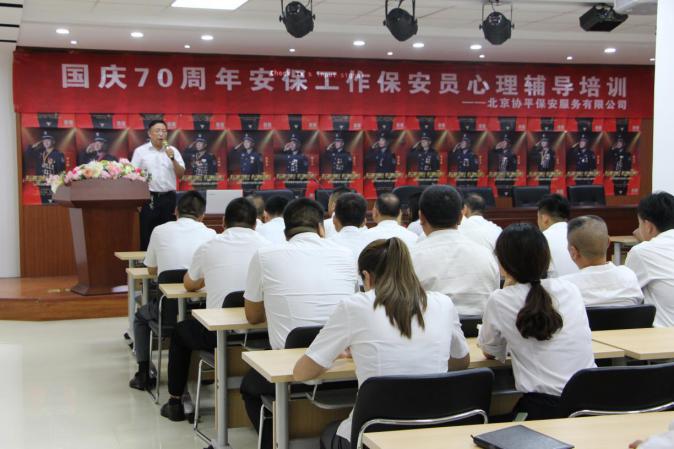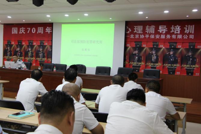 披甲执剑待出征,金戈铁马啸长空。自协平公司召开建国70周年大庆安保动员誓师大会以来,全体员工厉兵秣马、精神振奋,全力备战国庆安保。为进一步筑牢安全屏障、打好内部安全主动仗,8月15日上午,协平公司结合落实国庆安保“四大培训”内容,在前期进行心理测试的基础上,专门邀请司法部预防犯罪研究所办公室张翼伟主任和金鑫研究员,围绕“如何有效预防保安员违法犯罪”、“心理问题原因分析及疏导方法”两个专题进行了心理辅导培训。公司领导班子成员、总部机关人员和北京项目部全体班队长在现场参加了培训,京外各区域公司通过观看远程视频直播的方式参加了本次培训。