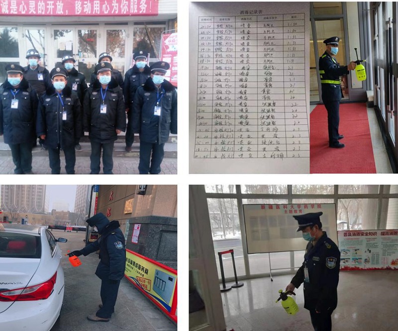 即使远在新疆,疫情防控工作依然没有丝毫放松。在新冠肺炎疫情暴发后,新疆区域公司迅速传达落实集团公司和单位防疫工作部署,各班队利用交接班、例会等时机层层动员,组织队员反复学习《一线保安人员防护须知》、《新型冠状病毒肺炎科学问答》等,克服员工侥幸心理和麻痹思想,提高了大家思想认识,使“生命重于泰山,疫情就是命令,防控就是责任”逐渐成为大家的普遍共识。区域公司坚持把保安员工的安全健康放在第一位,第一时间统计各班队所需防疫物品并积极筹备,及时配发口罩、消毒液、体温计等防疫用品。针对新疆各地州采取交通管制措施防疫物资无法送达到各项目的情况,公司领导及时安排保安队长在当地购买物资,确保全体队员防护到位。公司上下严格落实疫情防控措施和疫情报告制度,以“一万”的努力防范“万一”的发生。