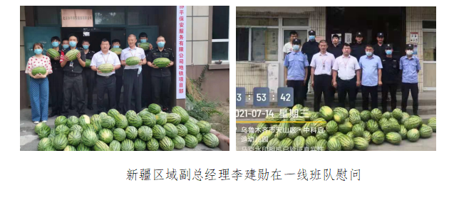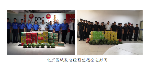 在北京,区域副总经理兰福全来到安保重点单位亮马桥外交公寓,将饮料、西瓜和防暑药品送到宿舍。他一边同休息的队员交谈,了解勤务情况,一边检查各项工作记录,了解单位夏季安全工作的落实情况。在遥远的新疆,李建勋副总经理深入到乌鲁木齐警务站和地铁项目一线,为队员们送去水果、矿泉水和防暑药品,带来公司领导的亲切慰问和关怀。在山东济南,副总经理钟国拉着一车的慰问品,挨个单位的送到队员手上,一边叮嘱班长安排好勤务,合理倒班,一边叮嘱队员们值勤中注意安全,注意防暑。在天津,副总经理宁克非和几个片区经理昼夜连续奔波,2天之内就将天津区域的所有项目班队走了一遍,每到一个班队都把送慰问品、检查勤务、叮嘱夏季安全和检查防疫工作的流程全部认真细致走一遍。