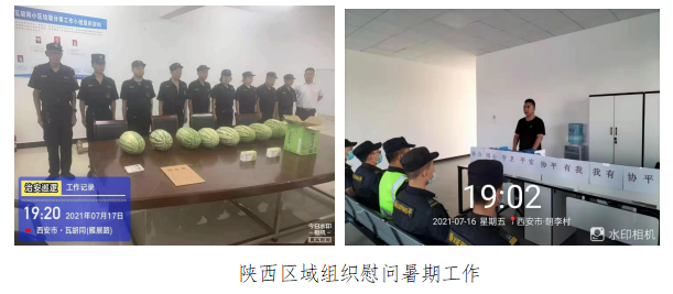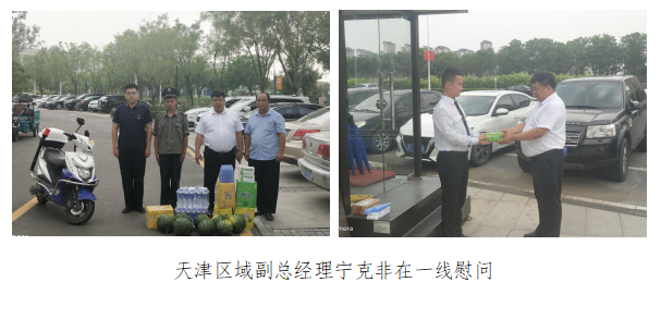 内蒙、川渝、江西、湖北、陕西、河南、宁青等区域公司,也先后组织开展本区域的慰问工作,从地铁车站到工厂医院,从居民小区到学校机关各级领导把公司的关爱送到了第一线,为保安员工们送去“清凉”,为大家战高温、斗酷暑和阻“疫情”加油鼓劲,增添了一份力量。