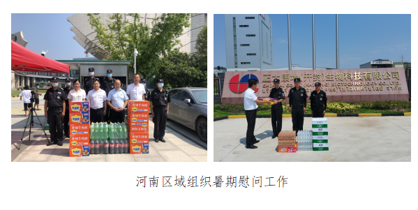 7月底至8月中旬,全国各地迎来高温酷暑+暴雨频发的极端天气。为确保全面推进落实夏季安全生产工作,进一步夯实夏季防暑、防极端天气和新冠疫情“常态化”防控的“三防”工作要求,公司工会组织各区域公司对一线保安员工开展暑期慰问工作。本次慰问由公司工会统一拨款,各区域公司根据当地需求,自行采购食品、饮料、水果、防暑药品等慰问 物资,由区域公司主要领导带队,深入一线班队,将慰问品送到每个单位,送到岗上队员的手中,激励保安员工振奋精神、忠诚履职,切实落实好夏季安全生产和防疫工作。
