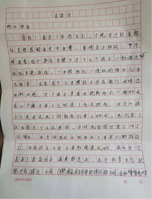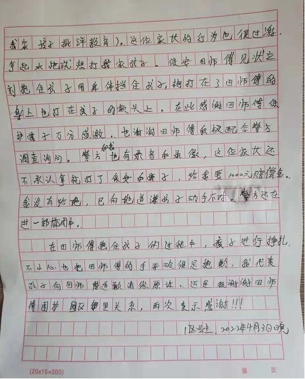 2022年4月3日,协平公司山东区域驻济南云世界班长田拥军在执勤时,反应及时,处置得当,成功制止了一起可能造成严重后果的治安案件的发生,业主写来表扬信送到单位表示感谢。