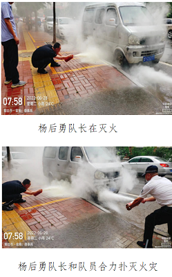 28日早上7点55分,御泰苑小区巡逻岗保安员吴恺武在巡逻期间,突然发现15号楼某业主停在小区门口的面包车发生冒烟自燃,当时自燃车辆前后都有其他车辆停放,如果不及时扑灭,火势扩大后势必会殃及其它车辆,造成严重损失。火情紧急,队员吴恺武一边迅速往南门岗跑去拿灭火器,一边上报队长着火地点和情况。保安队长杨后勇接报后,立即拿起灭火器第一时间奔赴起火现场。到达着火车辆时,火势已经逐渐加大,杨队长冒着浓烟和汽车爆燃的危险,尽可能靠近起火车辆,找准起火点进行喷射。但一个灭火器根本无法控制火情。这时队员吴恺武和其他支援力量也携带着灭火器赶来。在杨队长指挥下,大家合力迅速控制住了火势。最后在用掉多个灭火器后,将火灾成功扑灭,阻止了火情的大范围扩散,避免了重大事故和损失的发生。事后,车主及周围店铺业主对保安员的应急反应和专业处置给予肯定,并向灭火的队员们表达了诚挚的感谢。