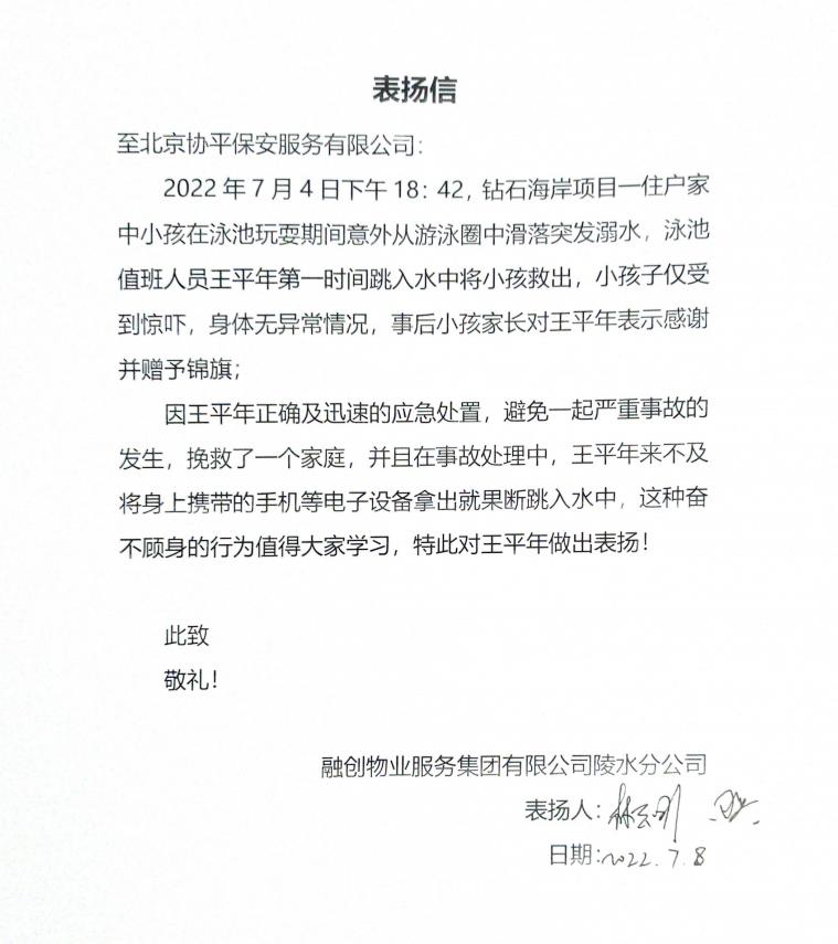 据了解,王平年同志在今年的3月17日还在泳池救了另外一位业主家的小孩。本次再次收到业主锦旗后,融创物业服务集团有限公司陵水分公司专门给公司发来表扬信,对王平年同志的先进事迹提出表扬。这不仅代表着甲方单位对我司保安员服务的认可,同时也为协平品牌赢得了荣誉。