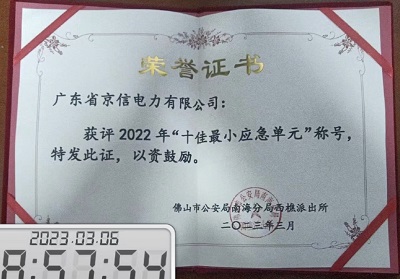 2023年03月06日下午14:00时,广东省佛山市公安局南海分局西樵派出所召开公安工作会议,我公司驻广东京信电力公司项目保安队负责人受邀参加了会议。会议中,西樵派出所领导专门为2022年在日常安保和应急处突工作中表现突出的10家单位颁发了“十佳最小应急单元”荣誉证书。