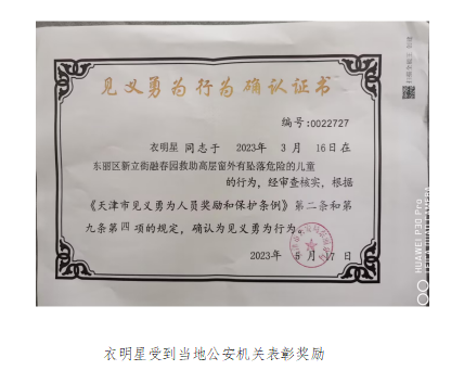 2023年5月17日,衣明星因“救助高层窗外有坠落危险的儿童”被公安机关确认为见义勇为行为,受到天津市公安局东丽分局的表彰奖励。公司也对衣明星见义勇为的事迹进行了通报表扬,对其进行了专项奖励,并号召全体员工向衣明星同志学习,弘扬见义勇为精神,传递社会正能量,协力同心,守卫平安,为当地社会经济发展作出应有的贡献。