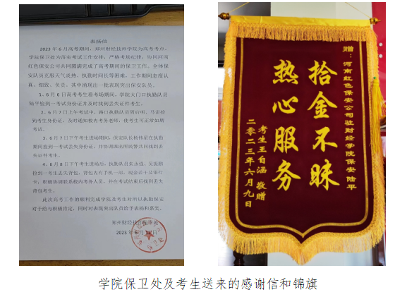 6月6日考生看考场期间,学院大门口执勤队员陆平捡到一考生身份证归还考生;6月7日上午,在学院路口执勤保安员周启明、马雷又捡到一张考生遗失的身份证,及时联系考务老师,归还考生;6月7日下午考生进场期间,队长杨伟星在执勤时再次捡到一考生身份证交现场执勤民警,后及时归还考生,使考生如期参加了考试;6月8日下午考生进场后,执勤队员朱永强、吴振鹏捡到一考生遗失的背包,经查背包内有手机一部,现金若干及银行卡等物品,及时联系校内考务人员,在考试结束后找到考生归还了背包。高考结束后,保安队收到了学院保卫处及考生送来的感谢信和锦旗。