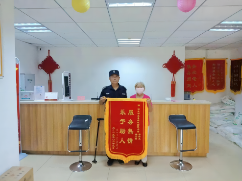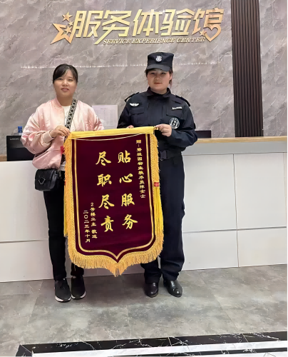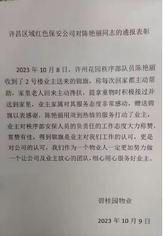 同样,在许州花园秩序部保安员陈艳丽在执勤中也主动搀扶老人,多次帮助老人将重物送到家里,其热情周到,积极主动的服务态度受到业务们一致称赞,2023年10月9日,2号楼某业主向物业送来锦旗和感谢信向小陈表示感谢。