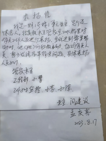 商丘中梁香缇花园项目保安员李新友,乔氏磊在门卫执勤期间,发现一位业主为独居老人,平时生活多有不便,便在工作之余帮该业主送搬运米、面、油等生活用品和大件物品,给业主维修水电,打扫卫生等,由于香缇花园项目是物业代收电费,每次估算老人电费快用完时,便主动询问及时帮助老人缴费,老人多次挽留二人吃饭,给二人赠送礼品,都被二人婉拒,2023年8月12日,业主向物业服务中心送来锦旗,表扬二人热情服务,乐于助人。同小区一期一号楼某业主退休在家,身体不适,生活不便,保安员李新友、陈萍积极协调楼宇管家及工程人员帮助老人排忧解难,业主向物业写感谢信表示感谢。