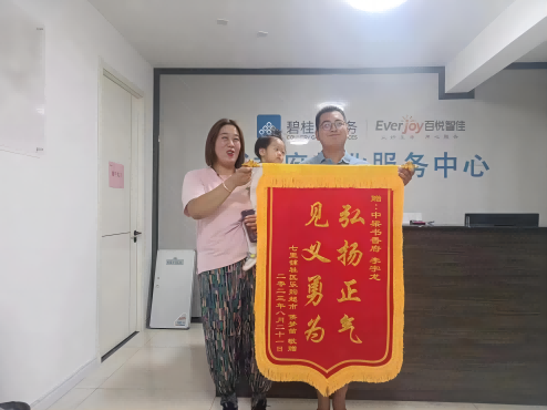 2023年8月21日傍晚,卫辉市中梁书香府保安员李宇龙在门岗执勤时,突遇暴风雨天气,看到业主侯女士在园区商业街口骑车艰难前行,马上要摔倒,在危急时刻李宇龙不顾暴风雨冒雨帮助侯女士撤离到安全区域,此后又冒前暴风雨中将一名女学生和一位女士转移至安全区域,事后,侯女士专程送来锦旗表示感谢。