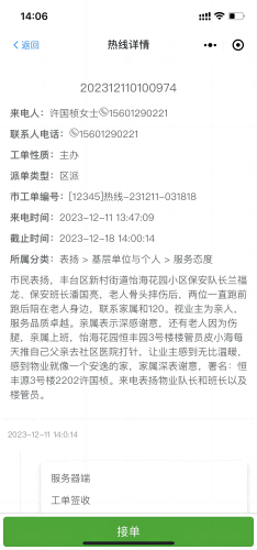 2023年12月11日,怡海花园小区业主许女士致电12345政务服务热线对驻勤保安员救助摔伤老人表示感谢。