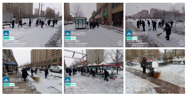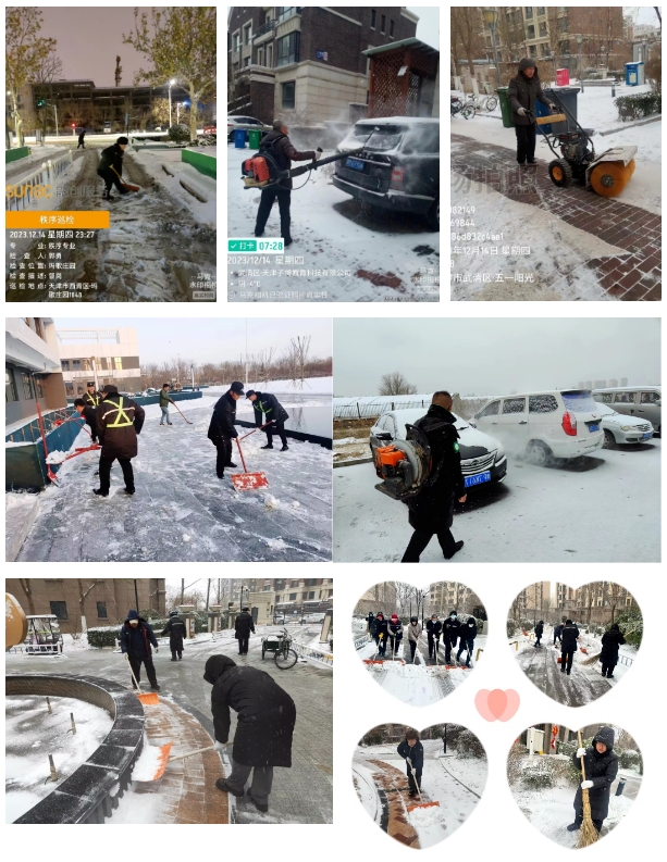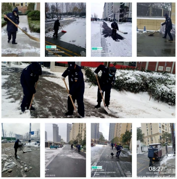 从2023年12月10日至12月14日,受较强冷空气影响,全国大部分地区出现降雪天气,局部地区大到暴雪,面对极寒天气,各区域公司提示保安员注意防寒保暖,做好自身安全防护,各级管理干部和保安员在风雪中坚守岗位,认真履行工作职责,在加强客户安全守护的同时,主动为服务客户扫雪除冰,保障客户和群众安全出行,在寒冷的冬日,用实际行动诠释了优质服务的内涵,传递了爱心与温暖。
