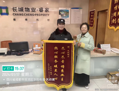 2024年1月17日成都天府美岸小区业主杜女士向物业送来锦旗。经了解,1月15日下午,川渝区域公司驻该小区秩序维护员卢秀花执勤时,在岗位附近捡到一条黄金项链(价值10余万元)及时报告秩序部主管并联系管家寻找失主,经多方寻找联系上业主杜女士归还失物,卢秀花同志拾金不昧的精神受到了失主及客户领导的称赞。