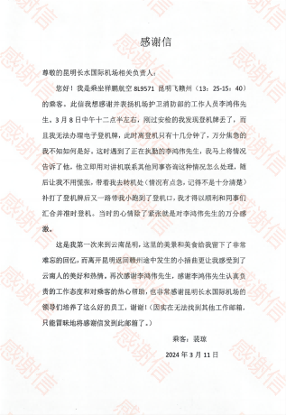 2024年3月14日,昆明长水国际机场工作邮箱收到乘客裴先生发来的感谢信,对云南区域公司驻勤秩序员李鸿伟表示感谢,经了解,原来3月8日该乘客乘坐祥鹏航空8L9571航班由昆明飞赣州,过安检时发现登机牌丢了,而且无法办理电子登机牌,如不能登机将影响团队的整体行程,耽误后续工作,此时离登机只有十几分钟了,裴先生万分焦急不知如何是好,看到正在值勤的李鸿伟便急忙上前求助,小李简短安慰乘客情绪后,便立即用对讲机向同事和机场有关部门咨询联系,带着乘客一路小跑前往值机柜台补打了登机牌,又以最快速度送该乘客到了登机口,使其和同事们顺利汇合并准时登机。