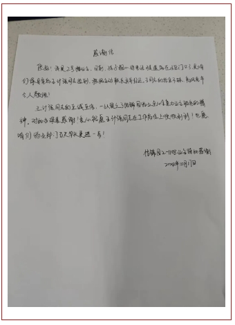 无独有偶,10月17日上午,怡海花园怡锦园2号楼某业主孩子不小心将家长手机遗忘在楼门口,被巡逻保安员王计强捡到及时归还,失主特意向物业写来感谢信表示感谢。