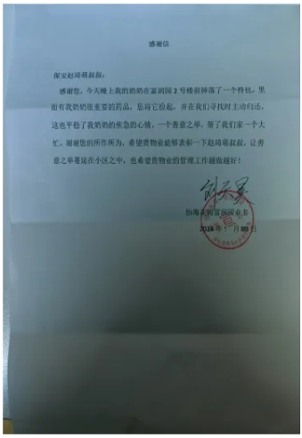 日前,驻怡海花园项目保安员赵琦萌在富润园2号楼附近巡逻时,在便道的休闲椅上捡拾一个黑色挎包,内装药品和相关证件,上报领导后交物业前台,经查找,与失主取得联系,认领失物,为表示感谢失主刘先生向物业送来感谢信。