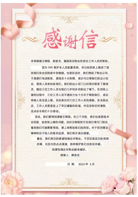 北京二部驻怡海花园某业主术后出院,999救护车送患者回家,因医护人员配置有限,抬担架送病人上楼回家的问题困扰了医护人员,接到求助后,保安员王锦程、柴俊杰、潘国旁提前赶到,伸出援手,协助医护人员将患者抬上楼,安全送到了家,解决了他们的难题。事后,医护人员和家属纷纷表示感谢,向物业送来了感谢信。驻东兴物业项目保安员刘富才、赵秋堂、崔志刚在工作中主动配合物业开展“防火专项整顿”活动,认真落实工作措施,对消防设施进行全面检查,确保消防通道畅通,对业主不文明的充电行为耐心加以劝阻,做到有礼有节,出色地完成了领导交办的工作任务,并得到了广大业主的认可。