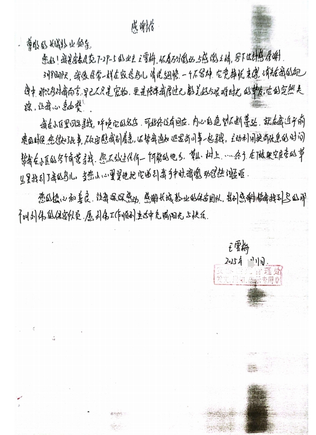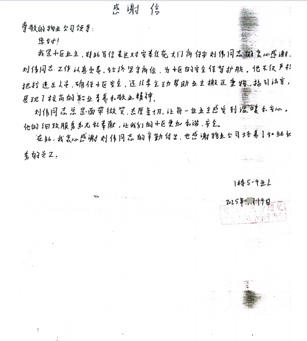 在近期工作中,川渝区域公司驻安泰家园项目部保安员刘伟同志收到多封业主亲笔书写的感谢信,信中高度赞扬其认真负责的工作态度和热心助人的职业精神。