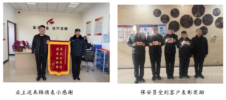 近日,该业主到物业送来锦旗向保安队表示感谢,客户领导得知此事后对保安队提出了表扬,并对肖敏、于占洋等4名同志给予了物质奖励。