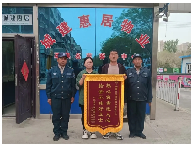 2025年4月3日,协平保安新疆区域公司驻巴州城建惠居物业项目保安员阿依帕夏·乌布力在执勤时捡到一部价值8000余元的华为mate60 pro 手机,经多方联系及时归还失主。4月23日上午,失主专门送来锦旗表示感谢。