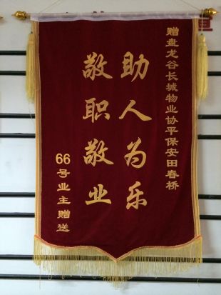 驻长城物业集团股份有限公司天津分公司(直属四队蓟县盘龙谷)保安队队员田春桥,经常在工余时间帮助盘龙谷卫城66号别墅区业主的两个老人干活,两个老人给田春桥报酬,被田春桥谢绝,业主为表示感谢,给田春桥送上一面锦旗。