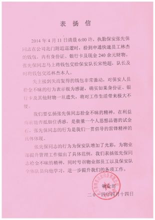 2014年4月11日驻北京康瑞普冶金设备有限公司(二项目部北京企发)保安队的队员张先保在北京康瑞普冶金设备有限公司北门附件巡逻时,拾到申通快速员工林杰的钱包,内有身份证、银行卡及现金240余元财物。张先保同志马上将钱包交给保安队长宋艳超,队长及时将钱包交还给林杰本人。失主林杰对张先保同志拾金不昧的行为表示非常感谢,给张先保同志送上一面锦旗。北京康瑞普冶金设备有限公司物业部号召物业部及保安队的全体员工学习张先保拾金不昧的精神,并给公司送来一封表扬信。