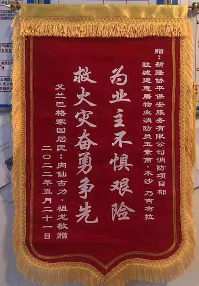 2022年5月21日,巴州城建惠居物业消防项目40号小区的保安队员玉苏甫·木沙和乃吉布拉·亚森在巡逻时,突然发现该小区22号楼一户业主房屋内冒出浓烟并伴有火光。两名队员第一时间拨打了报警电话,同时一面向物业经理报告,一面立即携带灭火器材赶赴现场。两名队员敲开房门之后,发现房间内仅有1名5岁的小女孩,没有看到大人。经观察起火位置在厨房燃气灶旁,当时火势已经很大,房间内浓烟弥漫,情况十分危急。两名员工首先将独自居家的小女孩安全救出房间,然后又不顾危险冲进房间灭火,并在消防人员和物业经理到场之前,成功地将火灾扑灭,避免了一起可能引发重大人员和财产伤亡的火灾事故。事后,消防人员和物业经理对两名员工的勇敢及专业质素提出了表扬,被救助小女孩的家人多次要以现金酬谢,两名员工均予以婉拒。近日,业主专门赠送锦旗表达感激之情。