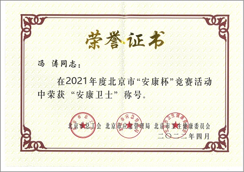 公司工会主席冯涛同志荣获2021年度北京市“安康杯”竞赛“安康卫士”荣誉称号