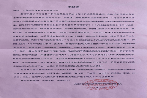 近日,公司收到山东区域公司服务客户北京科住物业齐鲁中科电磁院管理处发来的表扬函,对驻济南齐鲁中科电磁院保安队提出了表彰,并对张圣水、郝福军等数名班队长和骨干每人给予了现金奖励。