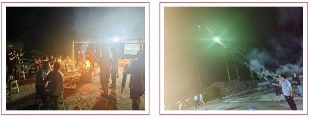 晚餐过后,拒马河畔的小广场灯火通明,广场中间的篝火正在熊熊燃烧,公司领导和同事们围坐在一起开启欢乐的篝火晚会。为使活动更加精彩有趣,公司党、团、工会及妇联精心策划,组织了歌唱、花毽、跳绳、投壶等趣味游戏,并准备了各种小奖品。晚会氛围热闹欢乐,同事们纷纷展示才艺,一首首耳熟能详的歌曲,唱出了协平人的心声与豪情。此时此刻,没有人会在意谁的歌声是否动听,音色是否优美,只有动感的音乐和激情的旋律才是最好的表达方式。踢花毽时一个漂亮的动作,同事间一个默契的配合,投壶时多次失败后一击精准地中签,都不时博得大家的喝彩声和掌声。突然广场的空旷处一片光亮,焰火灿烂,原来是开始放烟花了。一束束璀璨的烟花照亮了夜空,喷射着彩光刺向苍穹,在夜空中绽放,那绚丽的色彩交织在一起,宛如一场视觉盛宴,把晚会推向高潮。