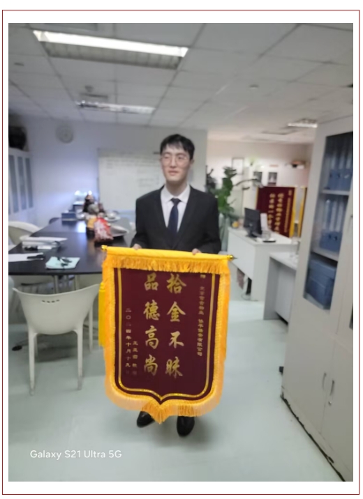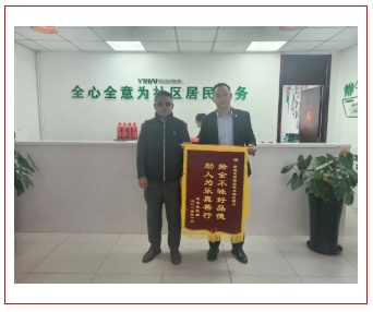 2024年10月8日上午10时许,北京区域二部驻怡海花园项目保安队长兰福龙在富泽园2号楼附近巡查时,发现一部电动车后座上放着一部苹果手机,环顾四周未见有人,为防止手机丢失,兰队在原地等待失主20分钟左右,也未见有人来领,只好将手机取走交物业予以保管,后失主朋友来电,物业告知情况,请其转告失主到物业认领了手机。10月20日,失主将提前制作的锦旗送到物业表示感谢,称赞“助人为乐真善行,拾金不昧好品德”