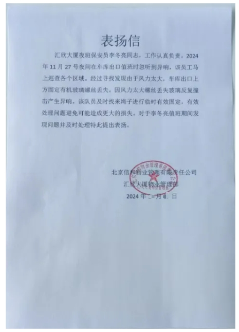 近日,北京二部驻汇欣大厦项目保安员李冬亮在车库出口夜班值勤时,忽然听到异响,立即对执勤区域进行查看,发现由于风力较大,车库出口上方固定有机玻璃的螺丝松动掉落,在风力作用下有机玻璃反复撞击框架产生异响,如不及时处理,玻璃掉落可能砸到人或车辆,便立即找来绳子进行临时固定,并将情况及时汇报物业进行处理,李冬亮的快速反应和迅速行动避免了可能发生的事故,排除险情后,客户向公司发来了表扬信,对李冬亮给予高度评价。
