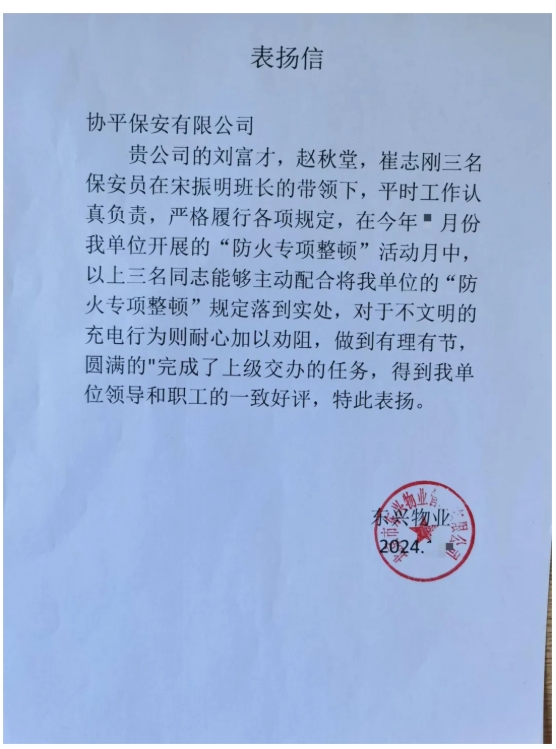 驻东兴物业项目保安员刘富才、赵秋堂、崔志刚在工作中主动配合物业开展“防火专项整顿”活动,认真落实工作措施,对消防设施进行全面检查,确保消防通道畅通,对业主不文明的充电行为耐心加以劝阻,做到有礼有节,出色地完成了领导交办的工作任务,并得到了广大业主的认可。
