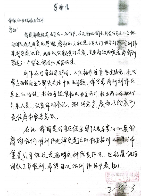 在近期工作中,川渝区域公司驻安泰家园项目部保安员刘伟同志收到多封业主亲笔书写的感谢信,信中高度赞扬其认真负责的工作态度和热心助人的职业精神。