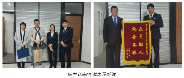 无独有偶,2025年4月18日上午9时许,北京二部驻北辰新空间项目保安员隋学海在大厦外围巡逻时捡到一个手提包,经查看,包内装有现金1300余元、身份证、驾驶证、银行卡及价值8万余元的医院发票。原地等候片刻,未见失主前来认领,便上交了客户保卫部门,上午10 时许,失主前来寻找,经核实认领了失物。为表示感谢,该失主于近日送来了一面写着“乐于助人,拾金不昧”8个大字的锦旗。