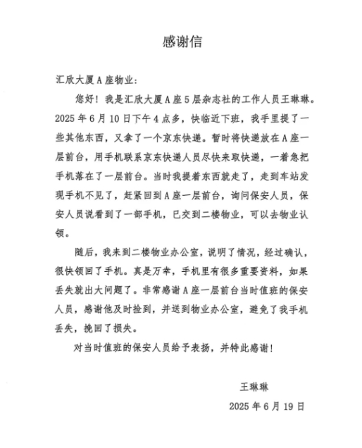 日前,汇欣大厦A座5层业主王女士,取完快递后将手机遗忘在了一层前台,被巡逻保安员发现后交到了物业,王女士到车站时发现手机不见了便返回寻找,巡逻队员得知情况后,告诉其到物业认领,后经物业核实,王女士拿到了自己的手机。事后王女士向保安队送来感谢信,在信中,王女士感谢保安员为其挽回损失,称“手机内存储很多重要资料,如果丢失就出大问题了”。