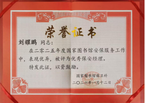 近日,我司驻国家图书馆项目安保团队传来喜讯。2026年1月12日下午,在国家图书馆保卫处召开的2025年度表彰大会上,我司安保团队1名驻场经理、4名班长、4名安检员及12名保安员受到客户单位表彰奖励。这份荣誉不仅是国家图书馆对安保团队过去一年工作的认可和肯定,更是对我司整体工作的鞭策与鼓励。